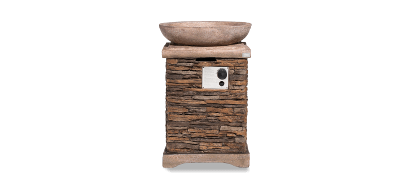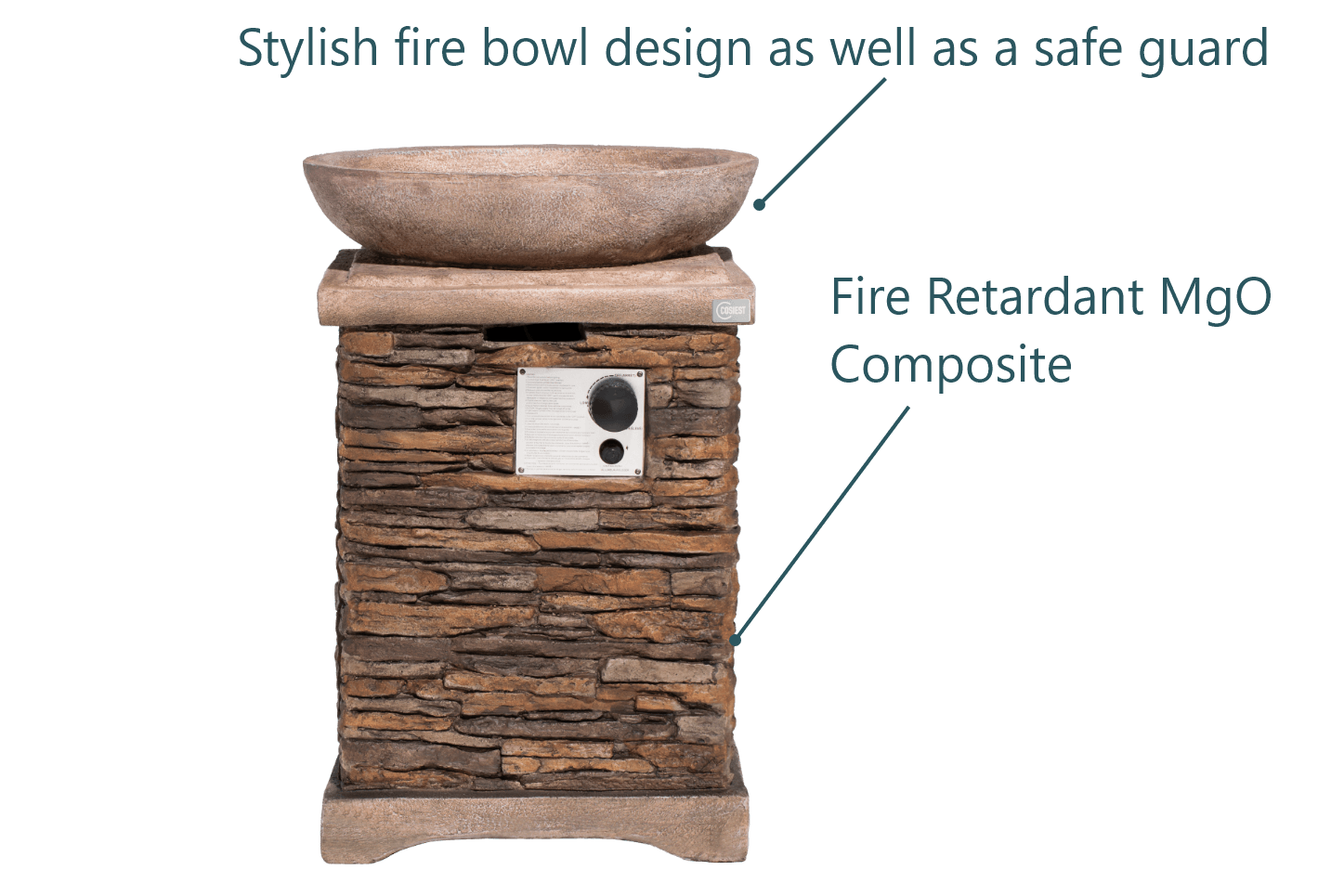 When the sunsets and your outdoor paradise begins to cool a bit, it's time to have fun. Light the column propane fire pit and warm up the patio at that moment. This stylish square stone fire table will attract all people’s sight. Doubling as a side table, the flame retardant sides act as a surface for setting down food and drinks. This sleek stainless steel burner not only looks durable, but the materials used are also designed to withstand the heat of the fire. The column fire pit table with faux brown ledge stone is covered in earth-toned lava rocks and surrounded by a magnesium oxide-coated metal table with the appearance of a stone finish, which is more resistant to heat and flame. What could be cozier? Clean burning propane flame provides soothing warmth, gentle lighting and a centerpiece for many outdoor evenings worth remembering.