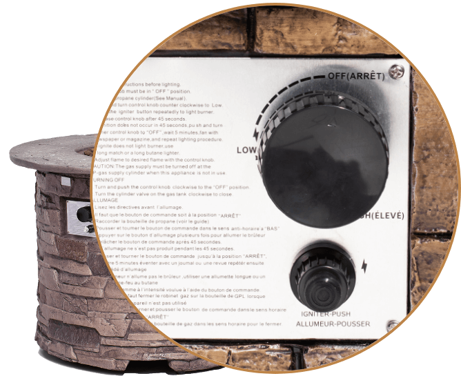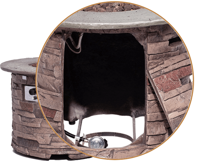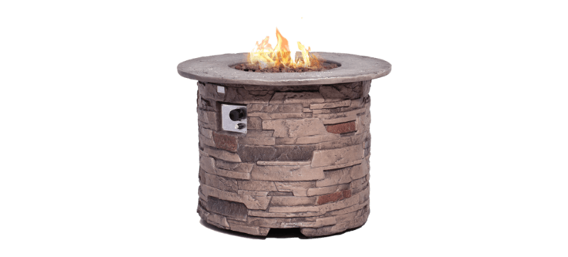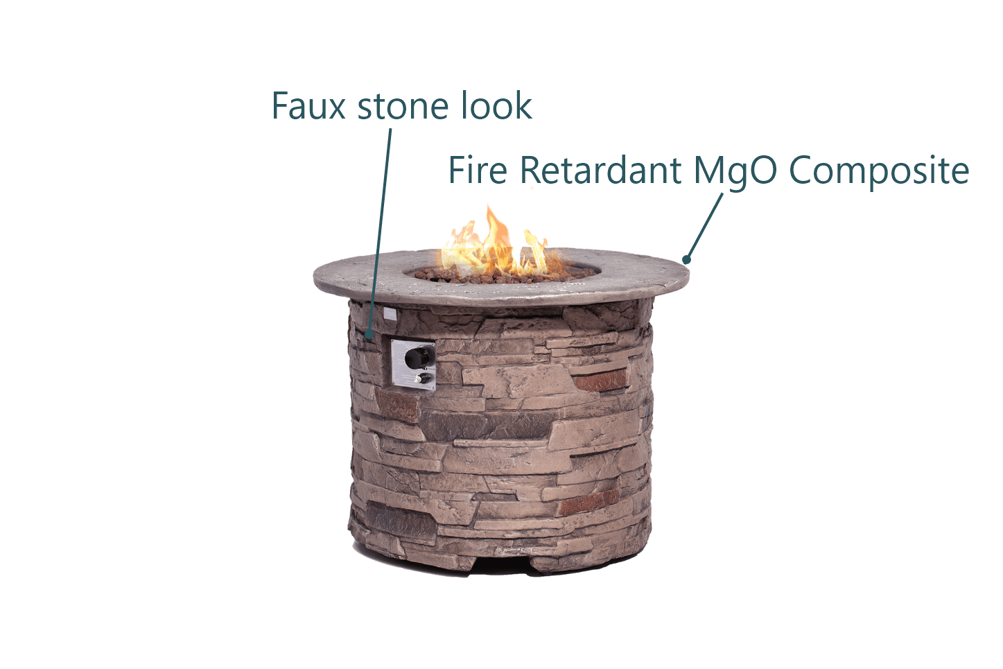 When the sunsets and your outdoor paradise begins to cool a bit, it's time to have fun. Light the round propane fire pit table and warm up the patio at that moment. This stylish round faux stone fire table will attract all people’s sight. Doubling as a dining table, the flame retardant sides act as a surface for setting down food and drinks. This sleek stainless steel burner not only looks durable, but the materials used are also designed to withstand the heat of the fire. The round fire pit table with faux brown ledge stone is covered in earth-toned lava rocks and surrounded by a magnesium- oxide-coated metal table with the appearance of a stone finish, which is more resistant to heat and flame. What could be cozier? Clean burning propane flame provides soothing warmth, gentle lighting and a centerpiece for many outdoor evenings worth remembering.