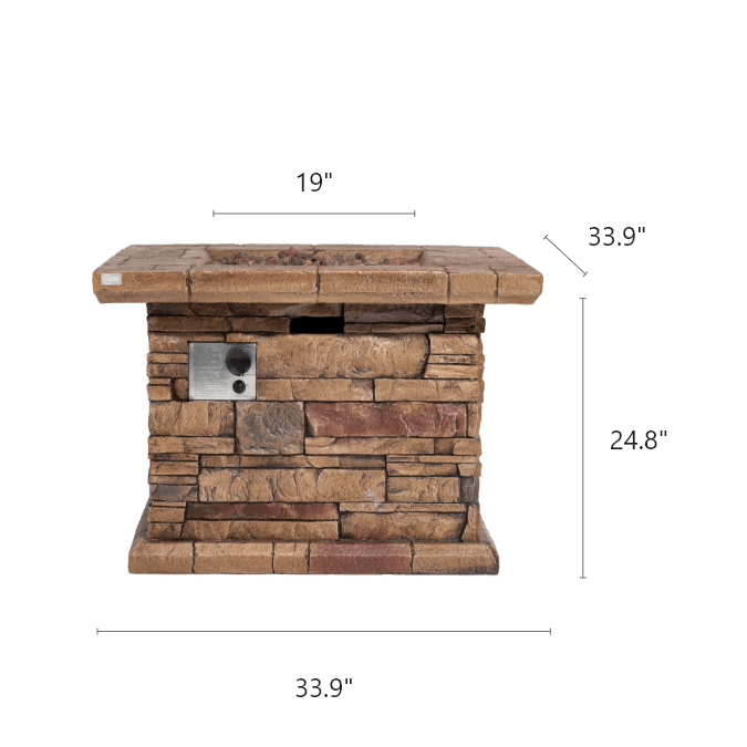 When the sunsets and your outdoor paradise begins to cool a bit, it's time to have fun. Light the square outdoor propane fire pit and warm up the patio at that moment. This stylish square fire pit table will attract all people’s sight. Doubling as a side table, the flame retardant sides act as a surface for setting down food and drinks. This sleek stainless steel burner not only looks durable, but the materials used are also designed to withstand the heat of the fire. The patio fire pit table with faux brown ledge stone is covered in earth-toned lava rocks and surrounded by a magnesium oxide-coated metal table with the appearance of a stone finish, which is more resistant to heat and flame. What could be cozier? Clean burning propane flame provides soothing warmth, gentle lighting and a centerpiece for many outdoor evenings worth remembering.